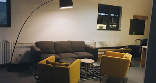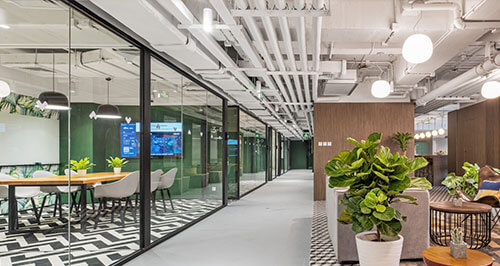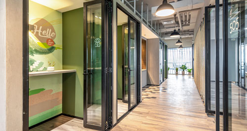 極客現(xiàn)代的裝修風(fēng)格作為主視覺——鮮明黃色和沉著黑色的墻面交錯(cuò)分布,輕松活潑,搭配紅色、橙色沙發(fā)或椅凳,實(shí)用而不呆板。長(zhǎng)廊右側(cè)以開放工位為主,空間寬敞,側(cè)面向陽的窗子使空間采光好。