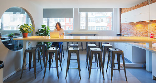 夢(mèng)想加空間別有洞天?臻g由黃色暖光吧臺(tái)區(qū)分割開來,一邊多為通透靠窗的開放工位、另一邊則以“聯(lián)排”封閉工位為主。