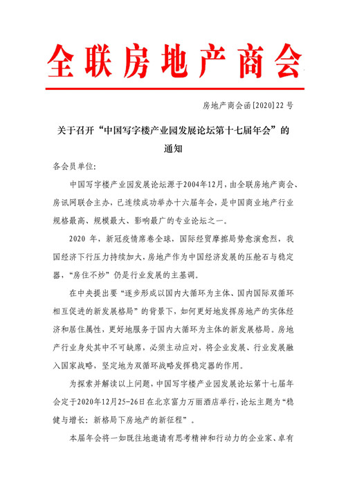 房訊網(wǎng)訊 近日,全聯(lián)房地產(chǎn)商會(huì)發(fā)布《關(guān)于召開(kāi)“中國(guó)寫字樓產(chǎn)業(yè)園發(fā)展論壇第十七屆年會(huì)”的通知》,2020年12月25-26日,中國(guó)寫字樓產(chǎn)業(yè)園發(fā)展論壇第十七屆年會(huì)定于在北京富力萬(wàn)麗酒店舉行,論壇主題為“重壓與重生:新格局下新商辦的新未來(lái)”。