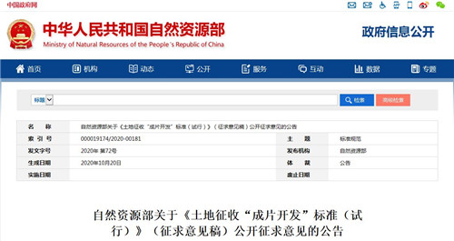10月21日,自然資源局發(fā)布關(guān)于《土地征收“成片開發(fā)”標準(試行)》(征求意見稿)公開征求意見的公告,對《土地管理法》中涉及的土地征收“成片開發(fā)”的相關(guān)內(nèi)容進行細化。