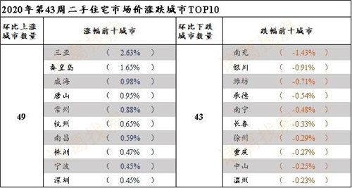 第43周,環(huán)比漲幅TOP10以珠三角、長(zhǎng)三角、環(huán)渤海的二線(xiàn)和三四線(xiàn)城市為主。其中,珠三角經(jīng)濟(jì)圈的三亞價(jià)格漲幅為2.63%,連續(xù)兩周位居價(jià)格漲幅首位;秦皇島價(jià)格漲幅為1.65%,位居漲幅第二,威海價(jià)格漲幅為0.98%,位居第三。