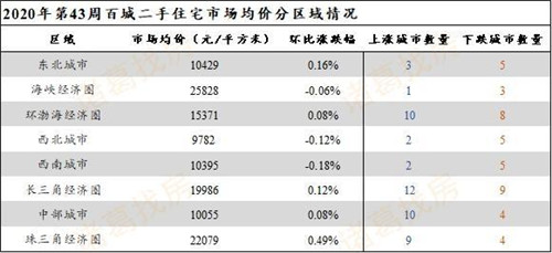 分區(qū)域來(lái)看,2020年第43周,有5個(gè)區(qū)域市場(chǎng)均價(jià)上漲,3個(gè)區(qū)域市場(chǎng)均價(jià)下跌。上漲城市中,珠三角城市市場(chǎng)均價(jià)為22079元/平方米,環(huán)比上漲0.49%,漲幅居首,東北城市市場(chǎng)均價(jià)為10429元/平方米,環(huán)比上漲0.16%,位居漲幅第二。下跌城市中,西南城市市場(chǎng)均價(jià)為10395元/平方米,環(huán)比下跌0.18%,跌幅居首;其次為西北城市,市場(chǎng)均價(jià)為9782元/平方米,環(huán)比下跌0.12%。
