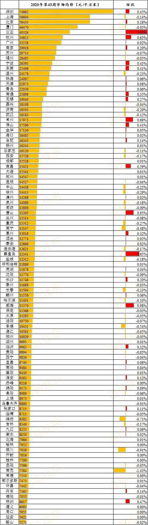 諸葛找房數(shù)據(jù)研究中心發(fā)布2020年第43周百城二手住宅市場(chǎng)均價(jià)報(bào)告。第43周,百城二手住宅市場(chǎng)均價(jià)為15441元/平方米,環(huán)比漲0.14%,漲幅較第42周擴(kuò)大0.08個(gè)百分點(diǎn)。環(huán)比漲幅TOP10以珠三角、長(zhǎng)三角、環(huán)渤海的二線(xiàn)和三四線(xiàn)城市為主;其中,珠三角經(jīng)濟(jì)圈的三亞價(jià)格漲幅為2.63%,連續(xù)兩周位居價(jià)格漲幅首位。