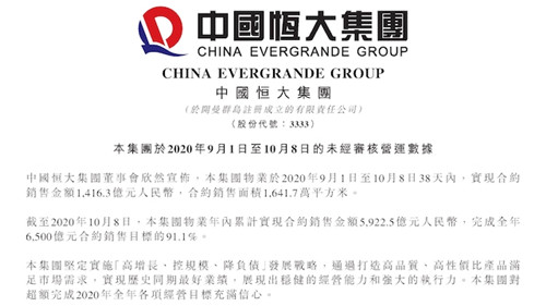 中國(guó)恒大也已披露目前的銷售業(yè)績(jī)。官方數(shù)據(jù)顯示,9月1日至10月8日38天內(nèi),恒大實(shí)現(xiàn)合約銷售金額1416.3億元,合約銷售面積1641.7萬平方米,已完成全年6500億銷售目標(biāo)的91.1%。