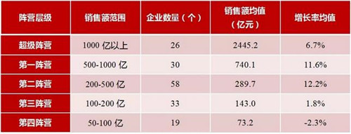 2020年1-10月,房企不同陣營的發(fā)展分化。1000億以上超級陣營共26家,銷售額增長率均值為6.7%。第一陣營(500-1000億)共有30家,銷售額增長率均值為11.6%。第二陣營(200-500億)有58家企業(yè),銷售額增長率均值為12.2%;第三陣營(100-200億)共33家,銷售額均值為143億元,第四陣營共19家,銷售額均值為73.2億。