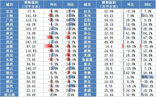 2020年10月各城市銷售面積監(jiān)測。數(shù)據(jù)來源:各地住建委、房管局;整理:諸葛找房數(shù)據(jù)研究中心