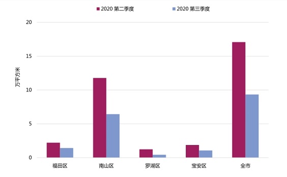 值得注意的是,南山區(qū)內(nèi)TMT行業(yè)集中度高且在疫情期間獲得了新的發(fā)展機(jī)遇,繼續(xù)引領(lǐng)著整體市場。根據(jù)第一太平戴維斯數(shù)據(jù),第三季度,南山區(qū)貢獻(xiàn)了約6.4萬平方米,占全市凈吸納量的68.9%。其中,以科技園和前海最為突出,兩片區(qū)受新興產(chǎn)業(yè)青睞,均有超過2萬平方米的凈吸納量。不過,在子市場需求出現(xiàn)了增長的同時(shí),由于高量供應(yīng)持續(xù)累積,未受疫情影響而顯著放緩,過量供應(yīng)仍是空置率上升主因。季內(nèi),全市平均空置率環(huán)比上升1.6個(gè)百分點(diǎn),至29.7%。其中,羅湖區(qū)、安區(qū)季內(nèi)無新增供應(yīng),空置率則環(huán)比回落。
