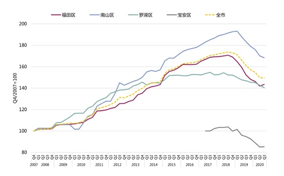 圖3:深圳甲級(jí)寫字樓子市場租金指數(shù)對(duì)比