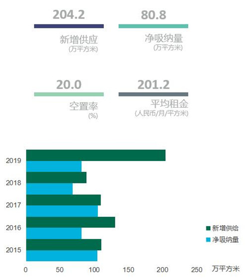 全年吸納量表現(xiàn)較為穩(wěn)定,共錄得超80萬(wàn)平方米的新增吸納。整體市場(chǎng)空置率年度同比上升8.7個(gè)百分點(diǎn)至年末達(dá)20.0%的高位,市場(chǎng)呈供過(guò)于求的整體態(tài)勢(shì)。