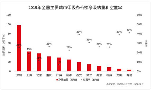 2019年全年甲級辦公樓凈吸納量約19.4萬平方米,較2018年峰值回落7.1%;與中國主要城市對比,西安甲級辦公樓凈吸納量位居全國第七位。
