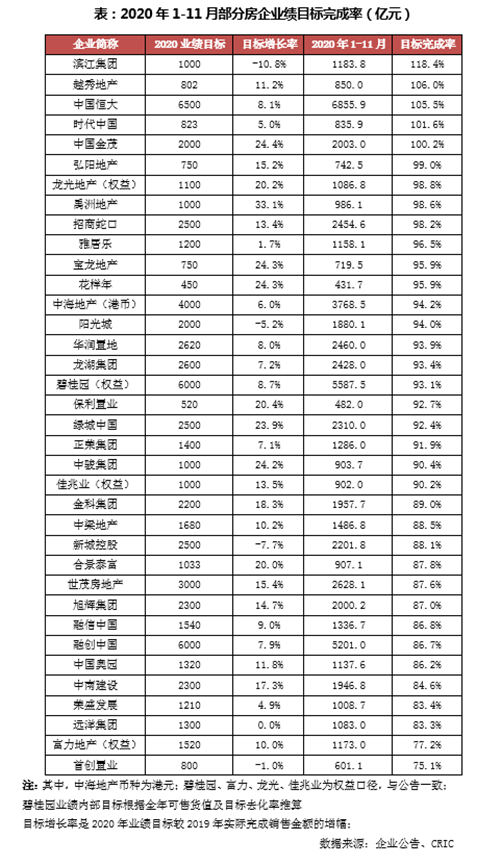 克而瑞統(tǒng)計(jì)顯未,截至11月末,在年內(nèi)設(shè)定了業(yè)績(jī)目標(biāo)的36家規(guī)模房企中,超六成房企的目標(biāo)完成率達(dá)到90%以上。其中,恒大、金茂、濱江、越秀、時(shí)代5家房企在11月提前超額達(dá)成了全年目標(biāo)。