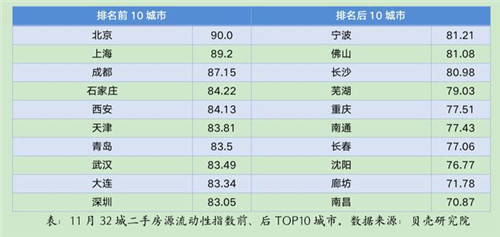 報告稱,分城市來看,存量房市場占主導的北京、上海及強省會城市成都房源流動性指數(shù)依然保持領(lǐng)先地位,分別為90、89.2、87.15,石家莊(84.22)和西安(84.13)表現(xiàn)亮眼,擠進TOP5行列。而新房交易占比較高的南昌、購房需求整體萎縮的廊坊、沈陽和長春,二手市場需求動力較弱,房源流動性在樣本城市中仍排名較為靠后。