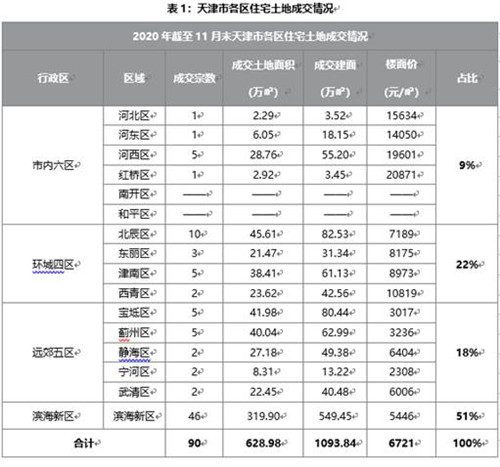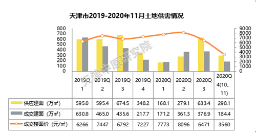 2020年天津土地市場的供需在上文提及的多重因素影響下比2019年下降超過50%。截至11月份全市累計(jì)供應(yīng)土地116宗,土地面積797.14萬㎡,折合建筑面積1378.71萬㎡;累計(jì)成交土地90宗,土地面積628.98萬㎡,折合建筑面積1093.84萬㎡。2019年全年土地成交金額為1194.7億元,而2020年截至11月土地成交金額為735.1億元,整整下降459.6億元。