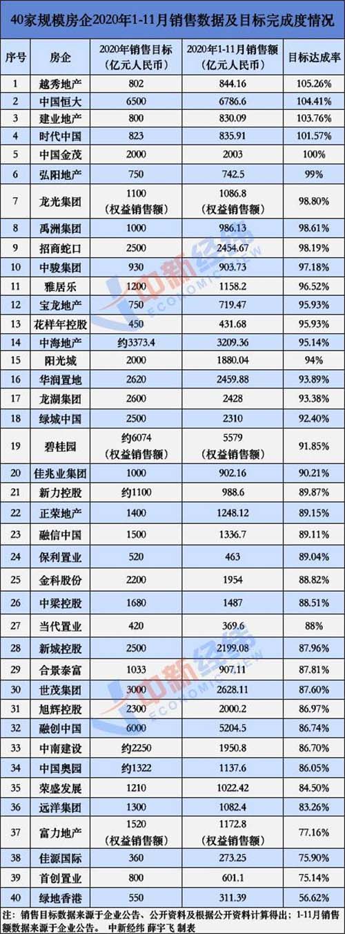 據(jù)中新經(jīng)緯客戶端統(tǒng)計(jì),截至2020年11月末,在公布2020年業(yè)績(jī)目標(biāo)的40家規(guī)模房企中,已經(jīng)有越秀地產(chǎn)、中國(guó)恒大、建業(yè)地產(chǎn)、時(shí)代中國(guó)、中國(guó)金茂5家企業(yè)提前完成全年的銷售目標(biāo),目標(biāo)完成度分別為105.26%、104.41%、103.76%、101.57%、100%。