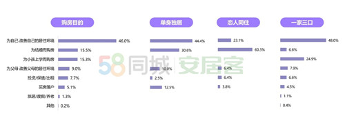 購(gòu)房群體畫像上,報(bào)告稱,調(diào)研人群中有18.9%為單身,一家三口同住的占比50.4%;有近六成居住在自有商品房,34.2%的人租房居住。對(duì)于購(gòu)房的意向,有71.7%的人打算在5年內(nèi)買房,另有13.2%的人在今年已經(jīng)購(gòu)房。購(gòu)房的主要目的依然是為改善居住環(huán)境,一家三口同住人群除為改善居住環(huán)境外,學(xué)區(qū)也是重要購(gòu)房因素。