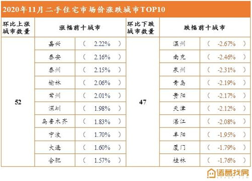 據(jù)《月報(bào)》,11月份二手住宅市場(chǎng)均價(jià)上漲城市52個(gè),較上月增加5個(gè),平均漲幅0.84%,漲幅擴(kuò)大0.37個(gè)百分點(diǎn);下跌城市47個(gè),較上月減少4個(gè),平均跌幅為1.05%,跌幅擴(kuò)大0.66個(gè)百分點(diǎn);持平城市1個(gè),較上月減少1個(gè)。11月上漲城市數(shù)量增加,隨著10月份“以?xún)r(jià)換量”潮的褪去,上漲城市數(shù)量恢復(fù)至往日水平。