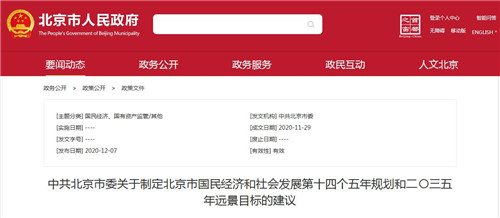 12月7日,中共北京市委發(fā)布中國(guó)共產(chǎn)黨北京市第十二屆委員會(huì)第十五次全體會(huì)議通過(guò)的《關(guān)于制定北京市國(guó)民經(jīng)濟(jì)和社會(huì)發(fā)展第十四個(gè)五年規(guī)劃和二〇三五年遠(yuǎn)景目標(biāo)的建議》。