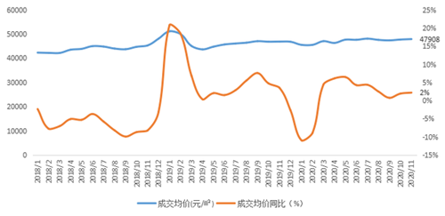 圖:北京2018年1月-2020年11月成交均價(jià)及其同比 (單位:元/㎡、%)
