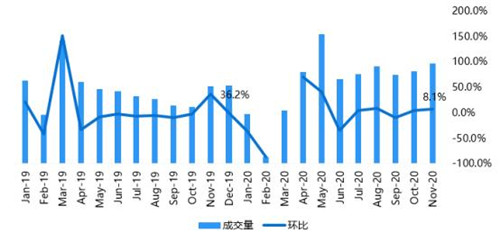 2020年11月宅地市場(chǎng)無(wú)成交,1-11月北京住宅用地市場(chǎng)累計(jì)成交建設(shè)用地面積254萬(wàn)㎡,同比連續(xù)三個(gè)月下滑至-12.4%。近期宅地市場(chǎng)供應(yīng)量較少,近四個(gè)月共6宗宅地供應(yīng),且計(jì)劃于12月入市,共計(jì)40萬(wàn)㎡,預(yù)計(jì)全年宅地市場(chǎng)成交量將略高于去年1個(gè)百分點(diǎn),整體與去年持平。
