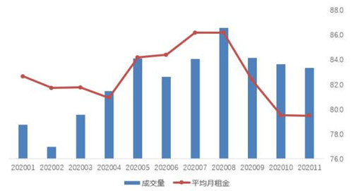 圖 2020年1-11月北京租賃住房成交量和平均月租金