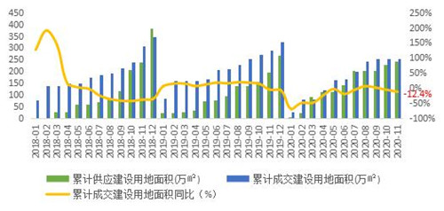 圖:北京2018年1月-2020年11月住宅用地累計(jì)供求面積及成交累計(jì)同比 (單位:萬(wàn)㎡、%)