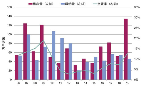 受大體量新增供應(yīng)和需求端的弱化的影響,2019年末全市空置率已上升至12.7%的高位,環(huán)比上升3.6個百分點,同比上升5.6個百分點,也是自2010年以來的最高值。