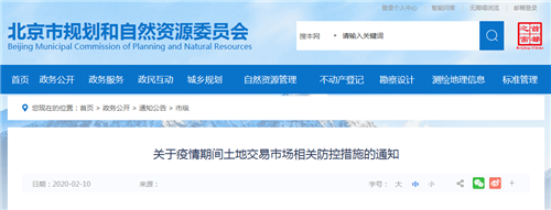 房訊網(wǎng)訊 2月10日,北京市規(guī)劃和自然資源委員會發(fā)布《關(guān)于疫情期間土地交易市場相關(guān)防控措施的通知》,針對疫情期間的土地市場交易制定六項工作措施。