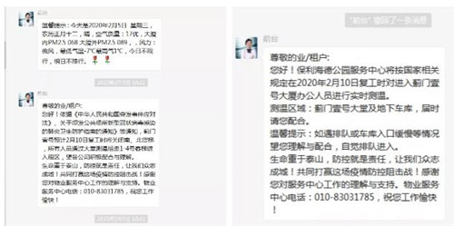 為做好新型冠狀病毒防治工作,北京保利物業(yè)各商寫項(xiàng)目自大年初三起開始提前確認(rèn)各樓層企業(yè)客戶開工時(shí)間,形成動(dòng)態(tài)臺帳,為復(fù)工防疫做好前哨工作。