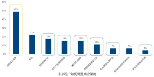 另外,約16%的租戶表示未來可能部分關(guān)店,此外還有約11%的租戶會調(diào)整開店策略以控制成本。