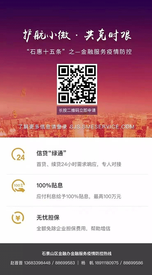 2020年2月2日,石景山區(qū)人民政府發(fā)布《石景山區(qū)關于共同應對新型冠狀病毒感染的肺炎疫情支持企業(yè)發(fā)展的若干措施(暫行)》(簡稱:“石‘惠’十五條”)支持中小企業(yè)政企協(xié)力,多措并舉,共克時艱今天,石“惠”十五條政策申請通道正式開通: