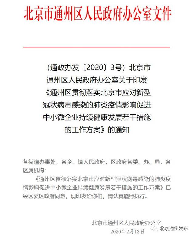 通州區(qū)貫徹落實(shí)北京市應(yīng)對(duì)新型冠狀病毒感染的肺炎疫情影響促進(jìn)中小微企業(yè)持續(xù)健康發(fā)展若干措施的工作方案