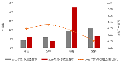 2019年,受宏觀經(jīng)濟(jì)放緩和中美貿(mào)易影響,企業(yè)租賃態(tài)度趨于保守,深圳寫字樓吸納有所減緩,加之供應(yīng)量巨大,供過于求的市場環(huán)境影響了整體空置率及租金水平。