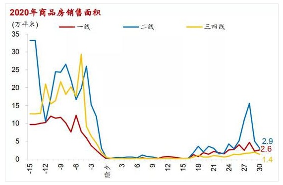 從區(qū)域結構上看,春節(jié)假期前后,房地產市場一般會出現(xiàn)返鄉(xiāng)置業(yè)潮,即三四線城市商品房銷售雖然成交減少但顯著好于一二線城市。2015-2019年的春節(jié)假期的前一周與后一周,三四線商品房銷售面積(10.4萬平米/天)是一二線城市(23.0萬平米/天)的0.45倍;而春節(jié)假期期間,三四線商品房銷售面積(0.85萬平米/天)是一二線城市(0.59萬平米/天)的1.44倍。今年春節(jié)假期前一周與后一周,三四線商品房銷售面積(6.4萬平米/天)是一二線城市(11.4萬平米/天)的0.56倍,而春節(jié)假期期間,三四線商品房銷售面積(0.14萬平米/天)是一二線城市的(0.40萬平米/天)0.35倍,比值較春節(jié)前后小幅下滑。今年春節(jié)“返鄉(xiāng)置業(yè)”景氣不再,主要受到疫情沖擊下人口流動受限影響。