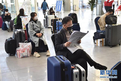 3月14日,一名從韓國飛來北京的入境人員在新國展集散地休息等待區(qū)看報紙。新華社發(fā)(陳鐘昊攝)