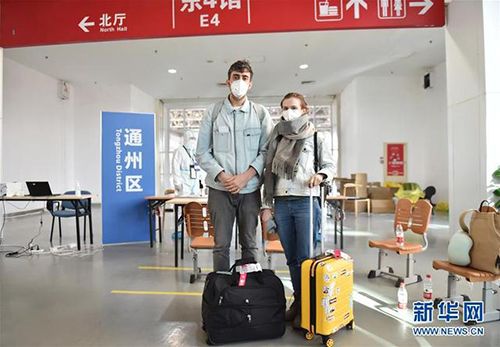 3月14日,在新國展轉(zhuǎn)運集散地北京市通州區(qū)集散點,從曼谷飛來北京的兩名俄羅斯旅客剛剛辦理完相關(guān)手續(xù)。新華社發(fā)(陳鐘昊攝)