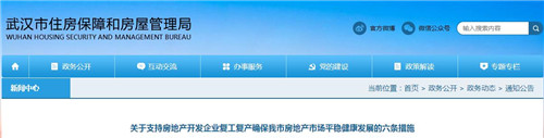 房訊網(wǎng)訊 3月23日,武漢市住房保障和房屋管理局發(fā)布《關(guān)于支持房地產(chǎn)開發(fā)企業(yè)復工復產(chǎn)確保我市房地產(chǎn)市場平穩(wěn)健康發(fā)展的六條措施》,全力支持房地產(chǎn)開發(fā)企業(yè)開工復產(chǎn)。