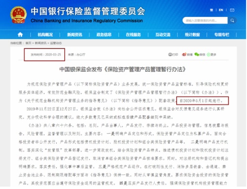 《保險(xiǎn)資產(chǎn)管理產(chǎn)品管理暫行辦法》已于2019年7月19日經(jīng)中國(guó)銀保監(jiān)會(huì)2019年第6次委務(wù)會(huì)議通過(guò),F(xiàn)予公布,自2020年5月1日起施行。
