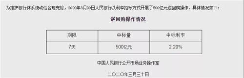 房訊網(wǎng)訊 3月30日,央行官網(wǎng)消息,為維護(hù)銀行體系流動性合理充裕,2020年3月30日中國人民銀行以利率招標(biāo)方式開展了500億元7天期逆回購操作,中標(biāo)利率為2.2%,較此前的2.4%下調(diào)20個基點(diǎn)。