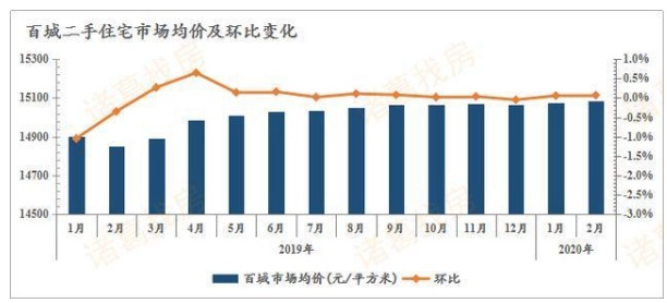 據(jù)諸葛找房數(shù)據(jù)顯示,2020年2月,100個重點城市二手住宅市場均價為15085元/平方米,環(huán)比微漲0.07%;與2019年2月相比,同比上漲1.09%,漲幅收窄0.06個百分點。整體上,2月份市場延續(xù)平穩(wěn)運行趨勢,市場價格保持溫和波動。