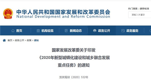 國家發(fā)展改革委關于印發(fā)《2020年新型城鎮(zhèn)化建設和城鄉(xiāng)融合發(fā)展重點任務》的通知