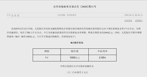房訊網(wǎng)訊 4月15日,央行發(fā)布公告,從2020年4月15日開始,人民銀行對(duì)農(nóng)村金融機(jī)構(gòu)和僅在省級(jí)行政區(qū)域內(nèi)經(jīng)營(yíng)的城市商業(yè)銀行定向下調(diào)存款準(zhǔn)備金率1個(gè)百分點(diǎn),分兩次實(shí)施到位,每次下調(diào)0.5個(gè)百分點(diǎn)。今日為實(shí)施該政策的首次存款準(zhǔn)備金率調(diào)整,釋放長(zhǎng)期資金約2000億元。