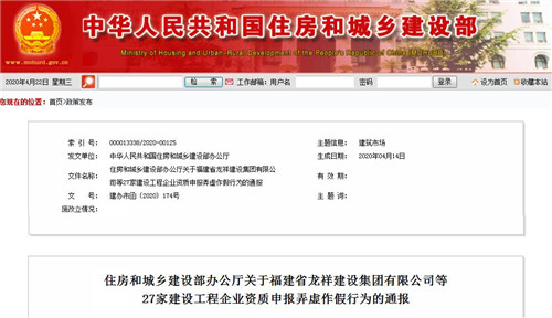 房訊網(wǎng)訊 近日,住房和城鄉(xiāng)建設(shè)部辦公廳發(fā)布27家建設(shè)工程企業(yè)資質(zhì)申報(bào)弄虛作假行為的通報(bào),經(jīng)查,福建省龍祥建設(shè)集團(tuán)有限公司等23家建設(shè)工程企業(yè)在資質(zhì)申報(bào)過(guò)程中存在弄虛作假行為;云南恒際建筑工程有限公司等4家企業(yè)在采用告知承諾制方式申報(bào)資質(zhì)過(guò)程中存在弄虛作假行為。