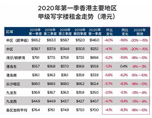 據(jù)戴德梁行分析報告,一季度香港各區(qū)甲級寫字樓的租金跌幅加劇,尤以核心區(qū)最為明顯。繼去年第四季后,香港甲級寫字樓市場吸納量再錄得負(fù)數(shù)值。本季寫字樓租賃活動幾近冰封,令全港整體甲級寫字樓市場吸納量錄得18年來最大的單季跌幅,主要來自金融、保險及共享工作空間行業(yè)的需求縮減。