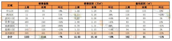 全市套均銷售面積為91㎡。套均銷售面積最大的是中山區(qū),為135㎡,高新園區(qū)本周受公寓銷售量大影響,套均銷售面積最小,為60㎡。