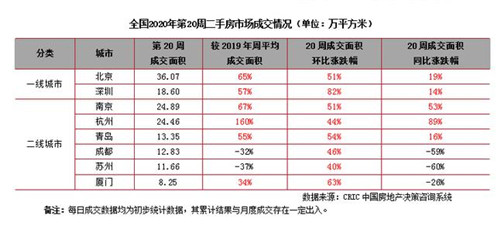 房訊網(wǎng)訊 據(jù)克而瑞地產(chǎn)研究數(shù)據(jù),第20周,8個(gè)重點(diǎn)城市二手房成交面積環(huán)比激增53%至150.1萬平方米,且同比跌幅收窄至5%。