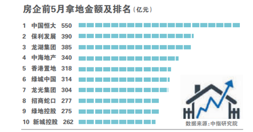 土地方面,2月以來,為數(shù)不少的房企開始加大在土地市場的投入。截止到5月底,恒大以550億元拿地金額躍居榜首,保利和龍湖分別以390億元、385億元拿地金額位列二、三名。其中,龍光集團最為搶眼,累計拿地304億元,單月拿地150億元,同比增長450%。