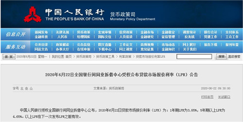 房訊網訊 6月22日,中國人民銀行授權全國銀行間同業(yè)拆借中心公布,2020年6月22日貸款市場報價利率(LPR)為:1年期LPR為3.85%,5年期以上LPR為4.65%。以上LPR在下一次發(fā)布LPR之前有效。