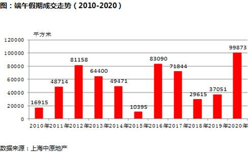 今年端午假期樓市成交表現(xiàn)活躍,成交創(chuàng)2010年以來假期新高。據(jù)上海中原地產(chǎn)數(shù)據(jù)顯示,今年端午假期6.25-6.27上海新建商品住宅的成交共計(jì)99873平方米,同比增加169.6%。