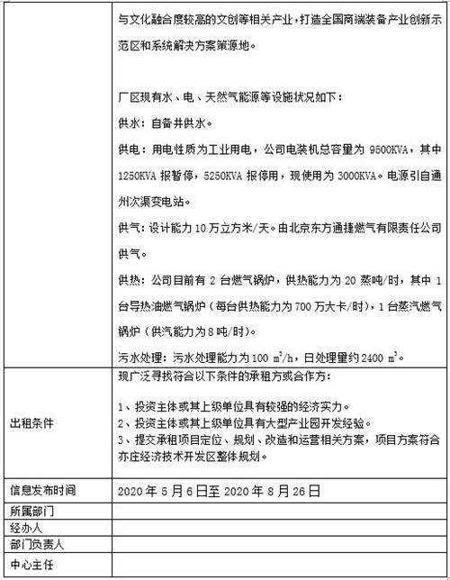 房訊網(wǎng)訊 日前,北京華騰橡塑乳膠制品有限公司在北京產(chǎn)權(quán)交易所掛牌公告,公司計劃將廠區(qū)部分土地出租或合作開發(fā),租金或合作開發(fā)方式面議。合作開發(fā)地塊位于通州區(qū)臺湖鎮(zhèn)光機(jī)電一體化產(chǎn)業(yè)基地興光五街6號,緊鄰國家級經(jīng)濟(jì)技術(shù)開發(fā)區(qū)--亦莊經(jīng)濟(jì)開發(fā)區(qū)。