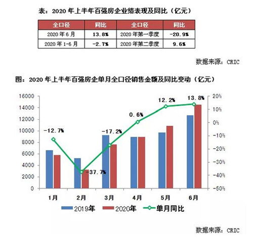 2020年6月,市場熱度持續(xù)、房企去化加速,TOP100房企單月實現(xiàn)全口徑銷售金額14517.2億元,環(huán)比增長33%。單月業(yè)績同比逐月回升,自4月轉正后進一步提升至13.8%。